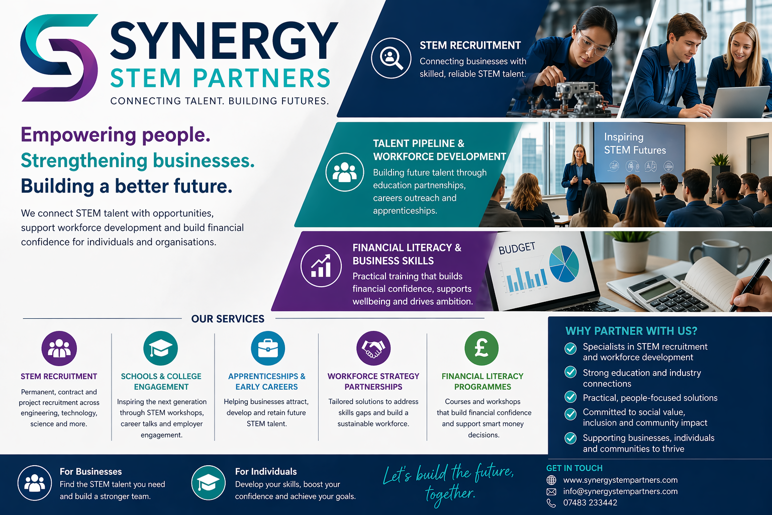 Synergy STEM Partners is an education, workforce development, and STEM recruitment consultancy operating across North Wales and the North West of England. We specialise in bridging the gap between education and industry, ensuring learning is aligned with real workforce needs.